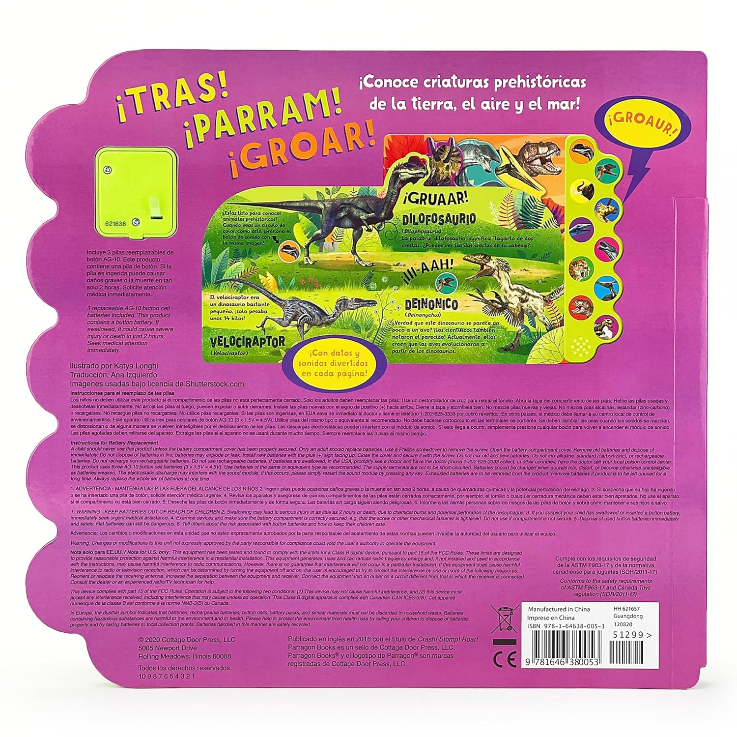 ¡TRAS! ¡PARRAM! ¡GROAR! ¡Viaja al pasado y escucha a los dinosaurios con este libro de sonido! Conoce a criaturas prehistóricas en la tierra, en el aire o incluso bajo el agua y aprende datos divertidos y de feroz por el camino. ¿Sabías que el Pteranodon podía tener una envergadura de más de 6 metros? ¿O que el Apatosaurus era herbívoro? ¿Qué es un herbívoro? Descubre la respuesta y explora estas increíbles criaturas, mientras presionas los 10 botones de sonido con una gran variedad de sonidos de dinosaurios. Este libro de dinosaurios mantendrá a tu hijo entretenido durante horas.10 emocionantes botones sonoros para que los niños vivan una experiencia interactiva.Los iconos de cada página se corresponden con los botones, lo que ofrece la oportunidad de practicar las habilidades motrices finas y de emparejamiento.Las gruesas páginas de cartón son fáciles de pasar una y otra vez para las manitas de los niños. ¡Colecciona toda la serie Parragon 10 Button Sound Book!